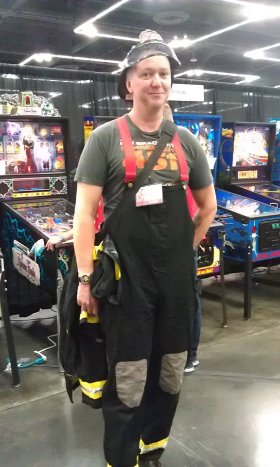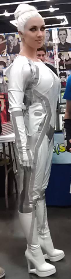 After a quick lunch of chicken strips and fries, we decided to take pictures of some great costumes. Nick found an amazing Doctor Manhattan, and then we noticed that the Fifth Doctor was next in line to meet Jewel Staite, so we waited around for him so we could get photos of his lovely cricket outfit. The fellow was very friendly, and had the Fivey poses down quite well! As we were finishing up our pictures, an Eleventh Doctor complete with fez and string mop came along, so we got more pictures of the two Doctors posing together with their Sonic Screwdrivers. Whovian heaven! We saw several other Doctors, male and female, that afternoon – including a Two in a fairly messed-up wig. We also spotted a Clockwork Droid and, of all characters to cosplay, the blue maintenance girl (Raffalo) in the Ninth Doctor “The End of the World” episode. I found a Guy Montag in his Fire Brigade 451 gear, playing a pinball machine. He appeared to be by himself, and after he finished his game, I asked if I could get a photo of him. He seemed incredibly surprised that anyone had recognized his “Fahrenheit 451” cosplay, and was happy to pose for me. I later saw him sitting down at Infinity Tattoo’s booth – I wonder what he got inked on his shoulder?