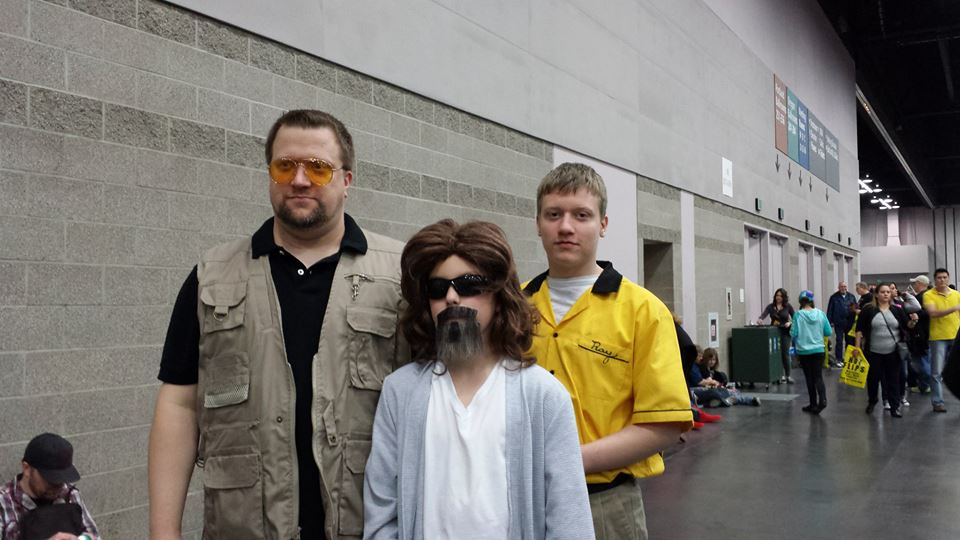 Cosplay of the Clockwork Droids from “Doctor Who” and The Dude, Donnie, and Walter from “The Big Lebowski.”
